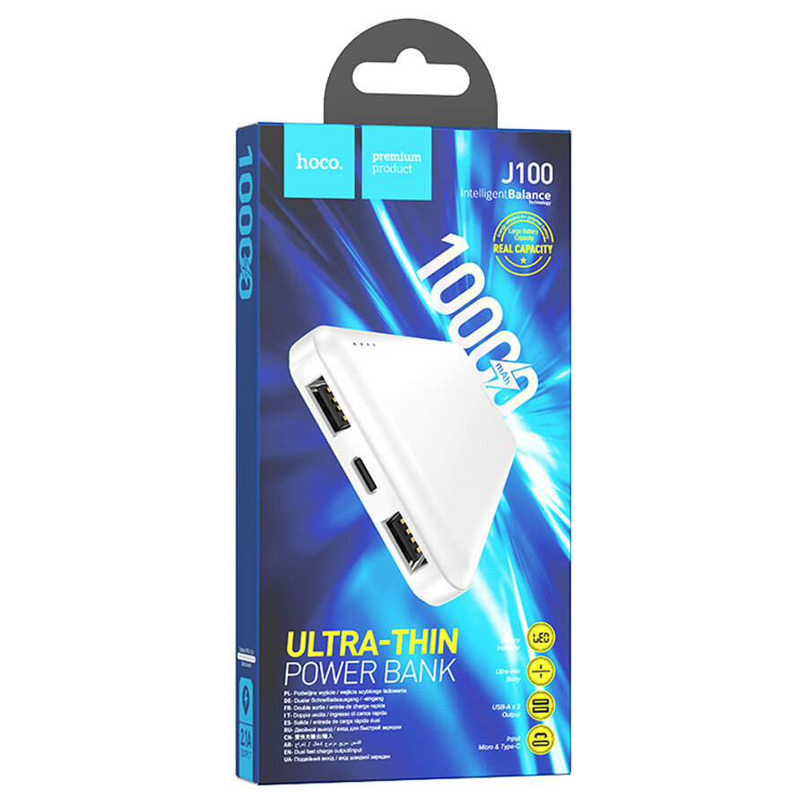 Портативный аккумулятор hoco J100 10000mAh, вх.: Micro-USB/USB-C, вых.: 2 x USB-Af, LED, белый