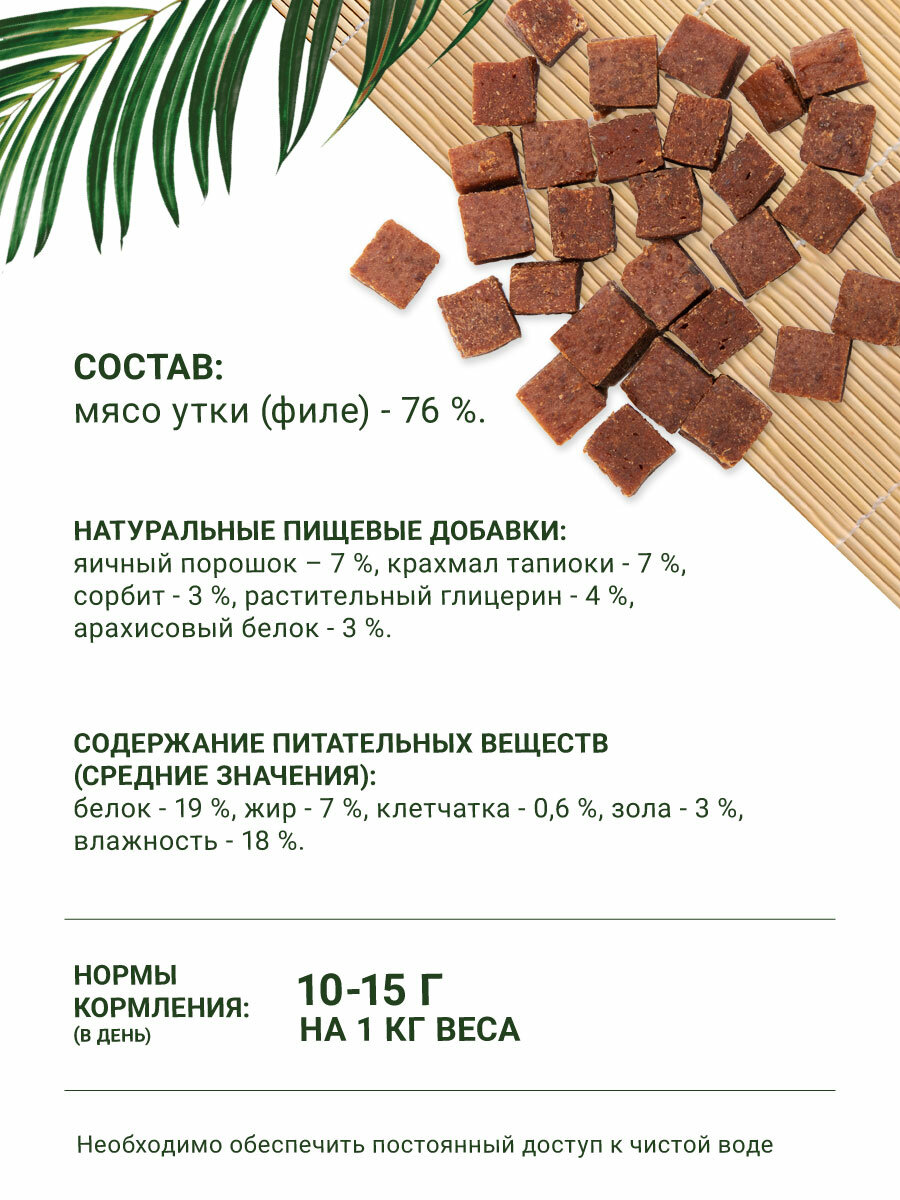 | Состав | утка – 92.8%, крахмал – 3%, пищевые добавки – 4%, соль – 0.2%; пищевая ценность: белок – 25%, жир – 3%, зола – 4%, клетчатка – 0.2%, влажность – 23% |