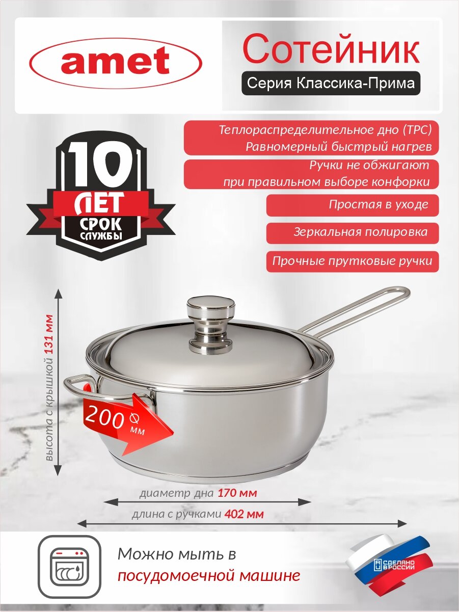СохранитьКастрюля-сотейник с крышкой Амет Классика-прима с Трс-3, 20 см, 2 л . интересное: