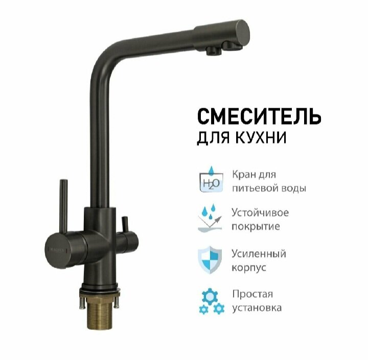 Смеситель кухонный графит, шаровый, с двойным выпуском воды для фильтра, материал латунь MAGNUS