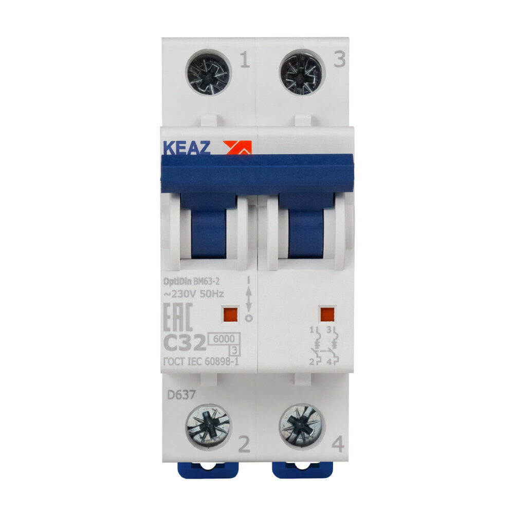 Выключатель автоматический модульный 2п C 32А 6кА OptiDin BM63-2C32-УХЛ3 (ВМ63), КЭАЗ 103680 (1 шт.)