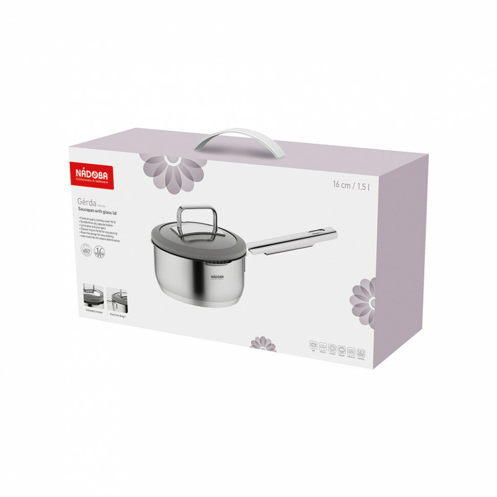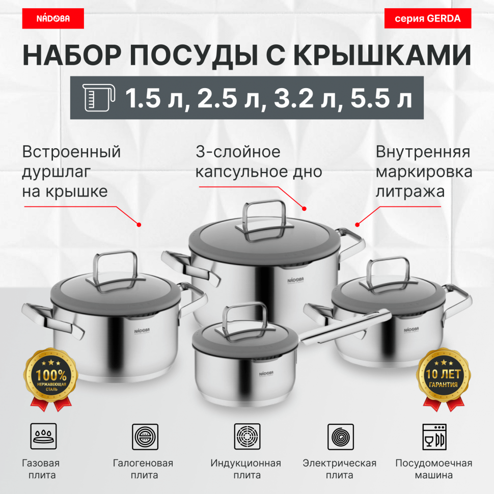 Набор посуды с антипригарным покрытием, с крышками, 8 пр, 1.7 / 2.5 / 3.2 / 5.5 л, NADOBA, серия GERDA интересное: