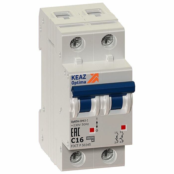 Выключатель автоматический КЭАЗ 2-полюсный (2P) 16А хар. C тип AC 6кА 260599 OptiDin BM63 (2 модуль)