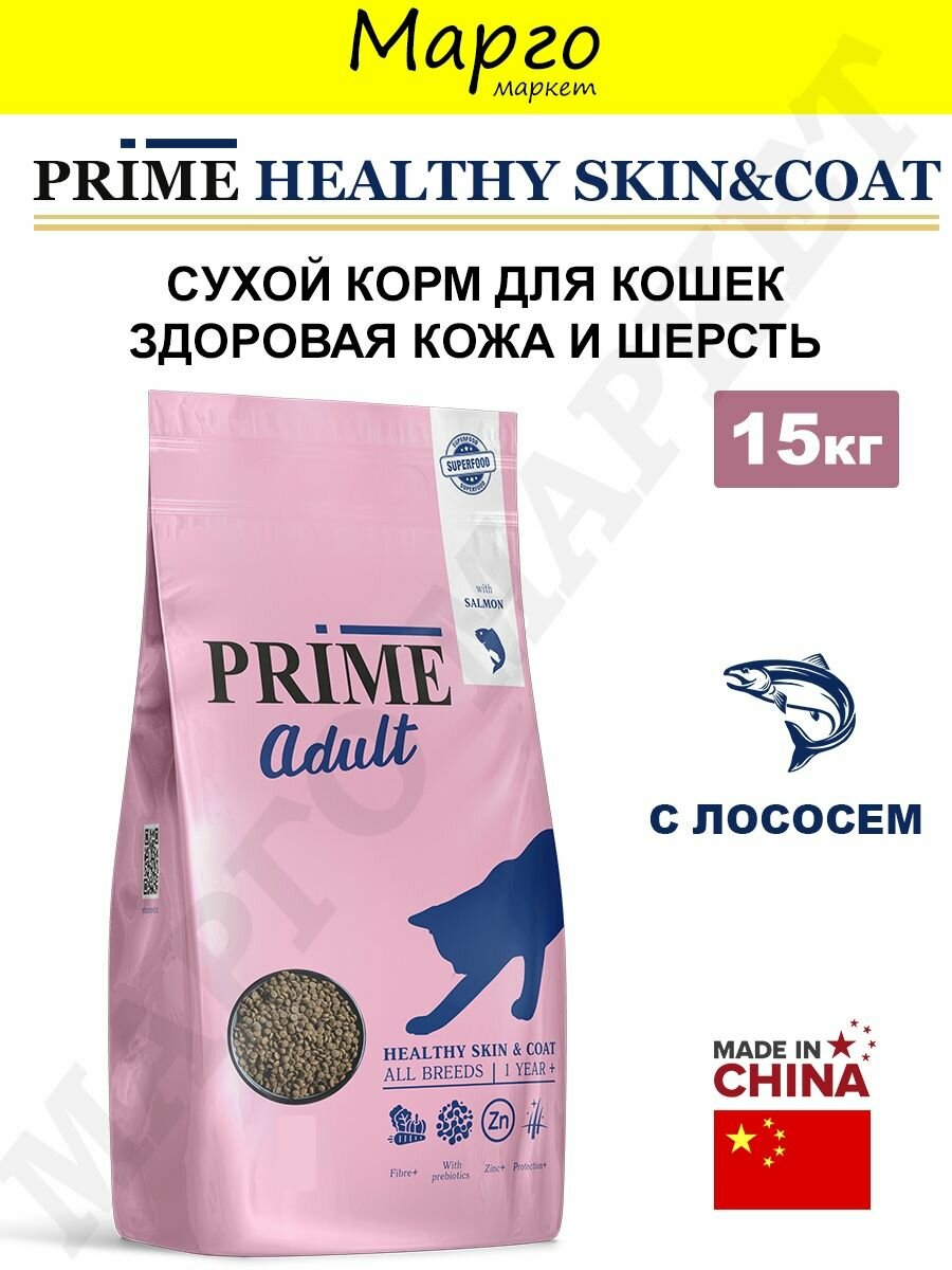 Купить Сухой Низкозерновой корм Прайм для взрослых кошек всех пород для Здоровой кожи и шерсти Лосось 15 кг