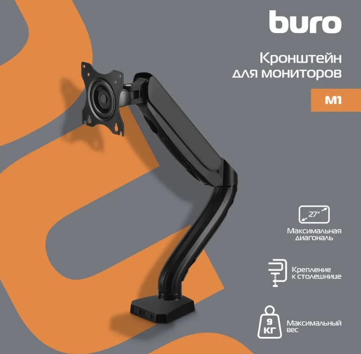 Кронштейн для мониторов ЖК Buro M1, до 27", до 9кг, крепление к столешнице, поворот и наклон, черный