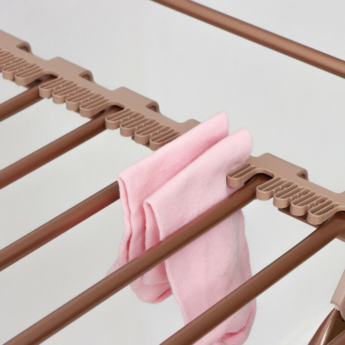 Прутья большого диаметра позволяют не оставлять заломов. Держалка для носков хорошо структурирует носки и они не занимают место. Сушилка из стальных трубок, т.е. не сказать чтобы легкая. Но это придает стабильности и позволяет развешивать белье с одной стороны, не боясь , что сушилка перевернется |