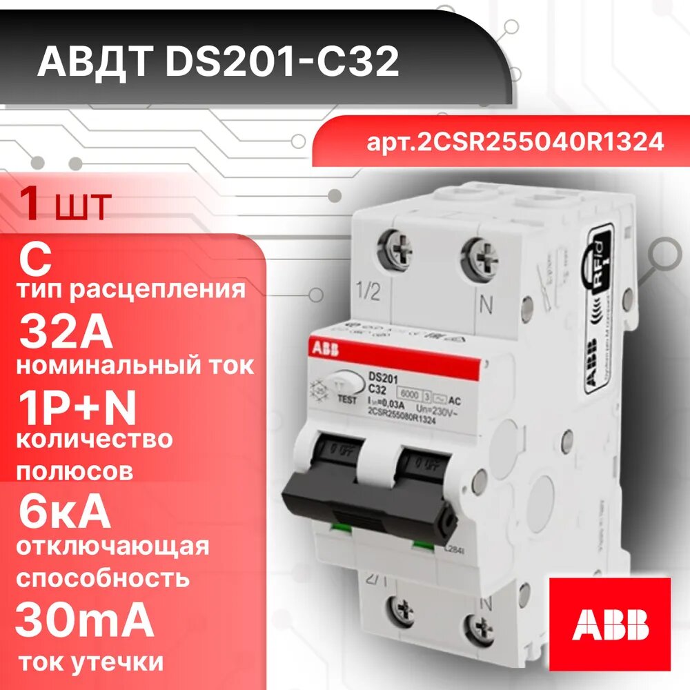 Диф автомат (АВДТ) ABB DS201 2CSR255040R1324 2P 32А С 6кА 30мА AC