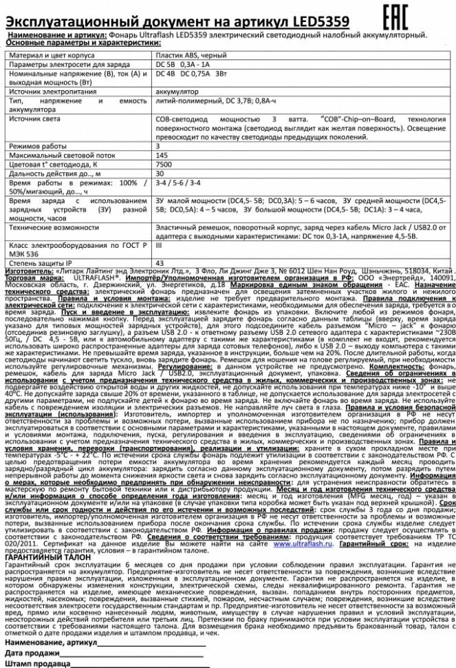 Ultraflash LED5359 Налобный аккумуляторный фонарь черный .