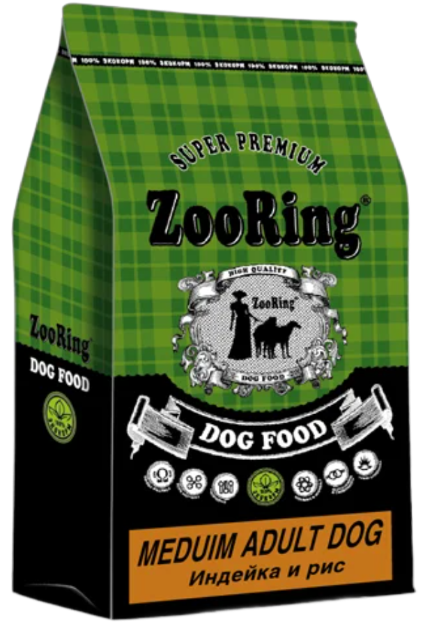Сухой корм ZooRing для молодых и взрослых собак всех пород MEDIUM ADULT DOG Индейка и рис 1уп. х 2кг.
