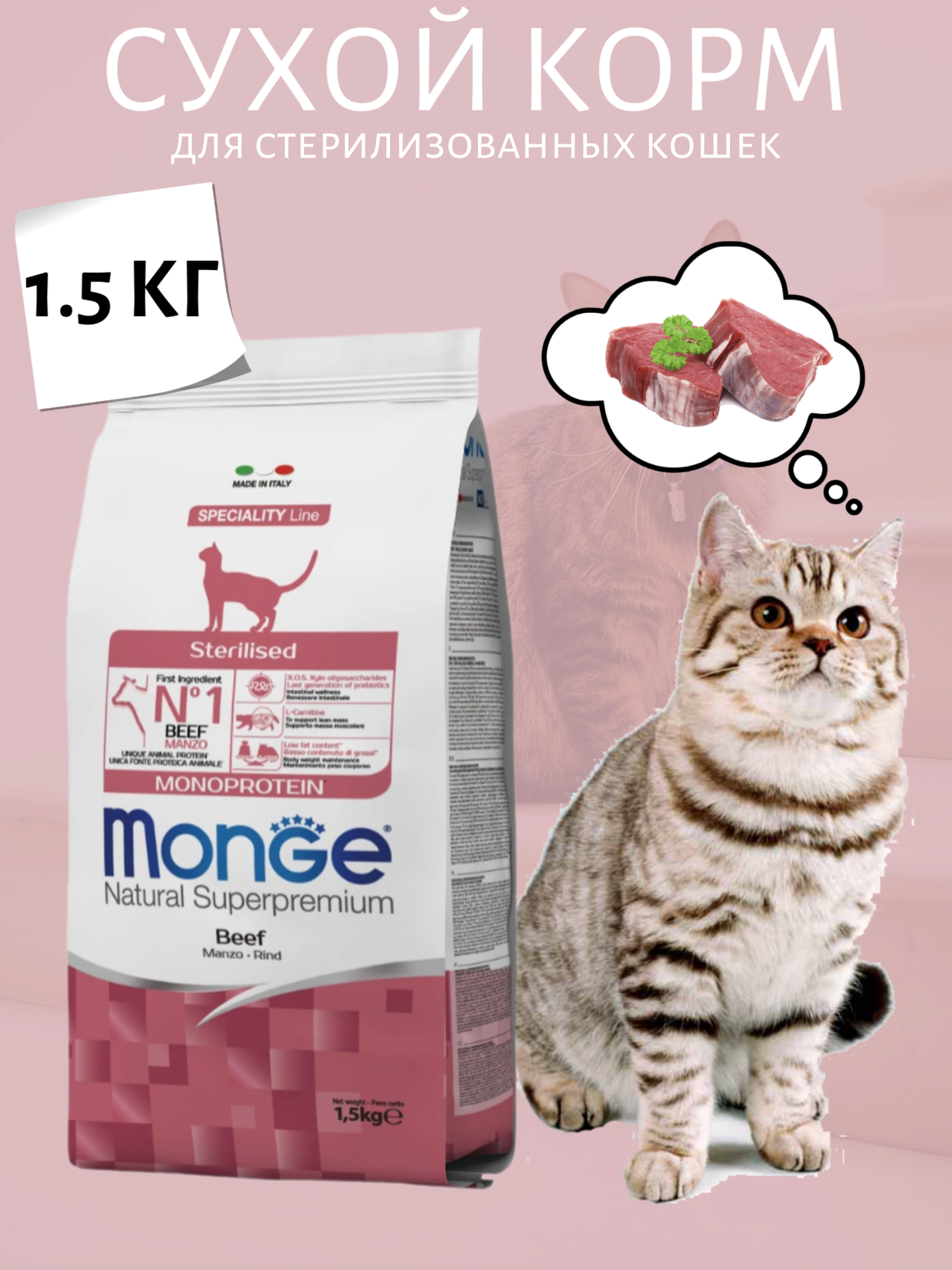 Сухой корм MONGE SPECIALITY MONOPROTEIN CAT STERILISED монобелковый для взрослых кастрированных котов и стерилизованных кошек с говядиной (1,5 кг)