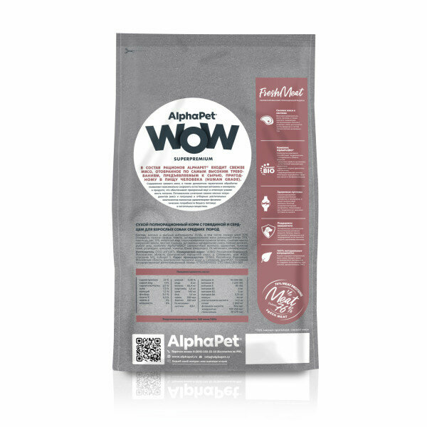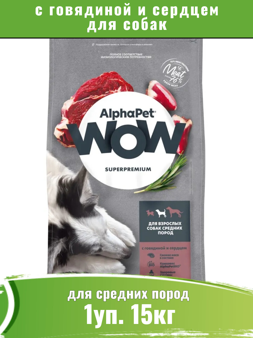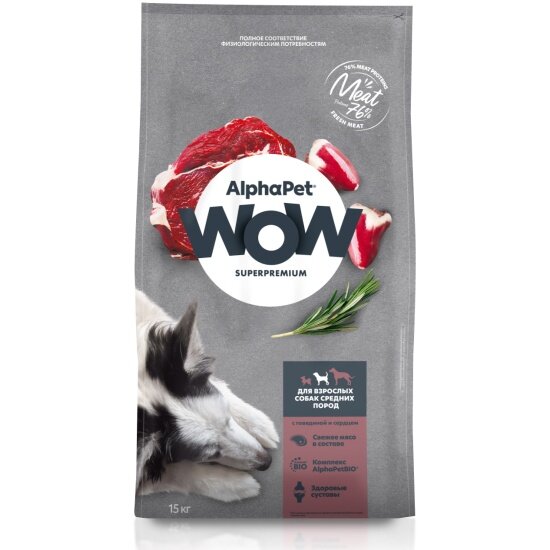 Купить Корм сухой Alphapet WOW Superpremium полнорационный для взрослых собак средних пород (с говядиной и сердцем) 15 кг