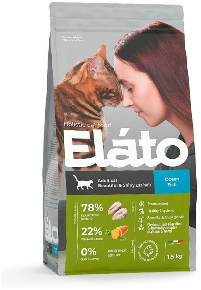 Купить Сухой корм холистик Elato для взрослых кошек с рыбой, для красивой и блестящей шерсти кошек, 1,5кг.