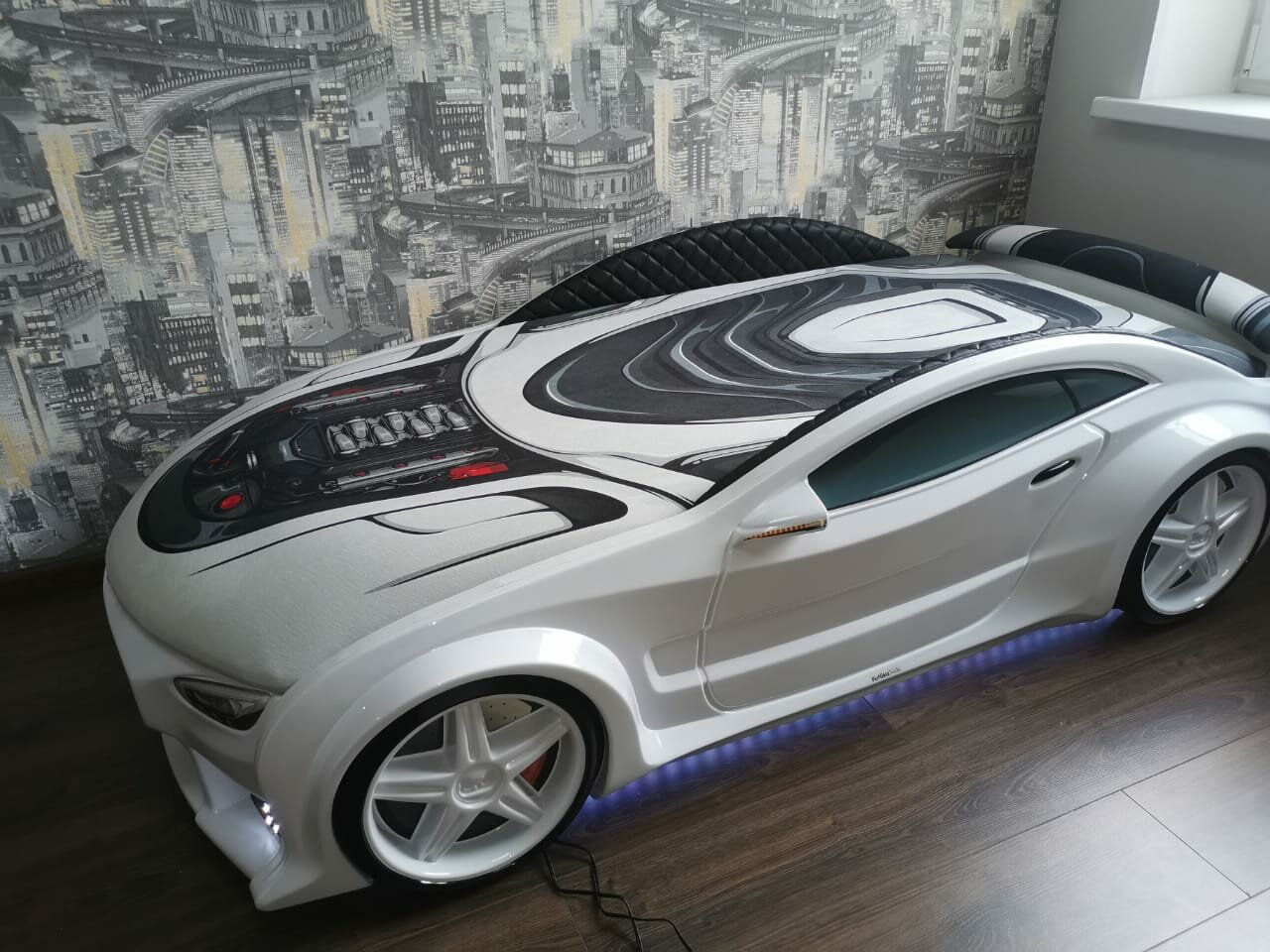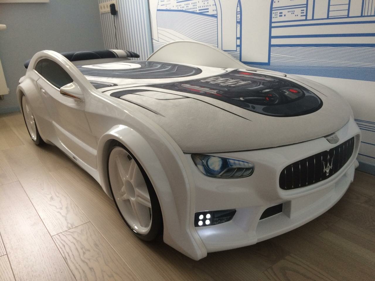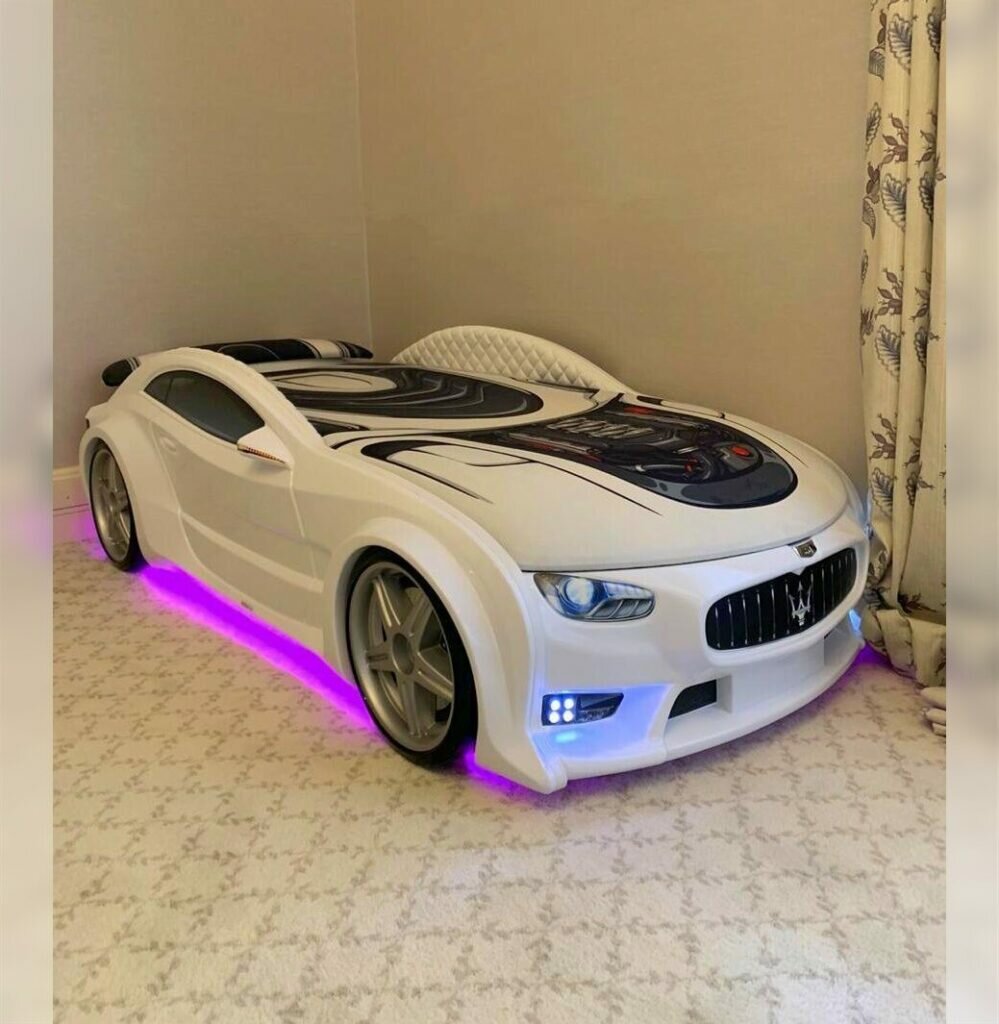 СохранитьFutuka Kids кровать-машина Neo Мазератти белый цвет белый c подсветкой фар и дна, спойлером, матрас в дизайне "sport" интересное: