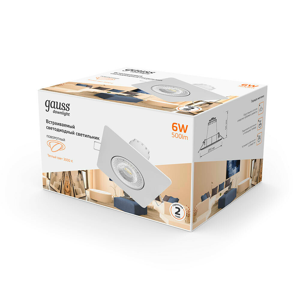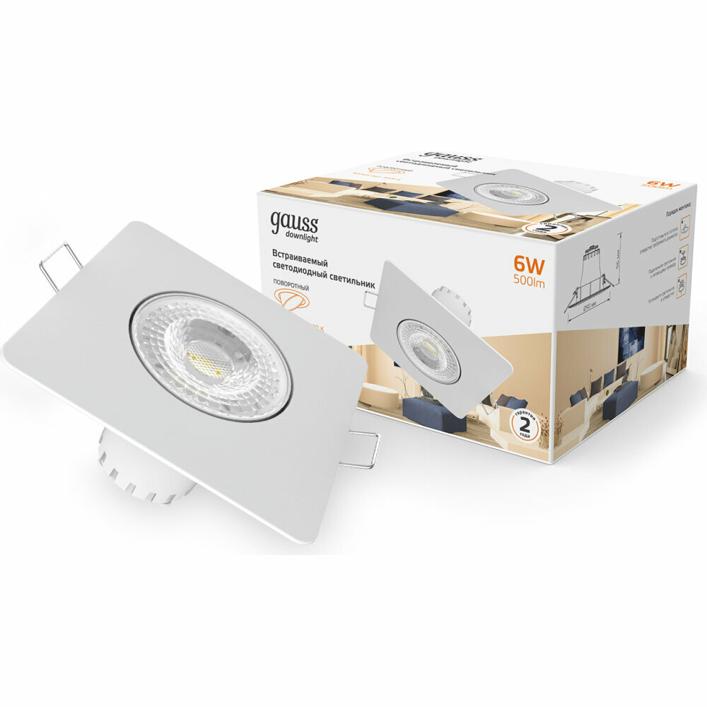 Встраиваемый светильник GAUSS Квадрат. Белый, 6W,90х90х56, 65мм 500 Lm LED 2700K 1/40