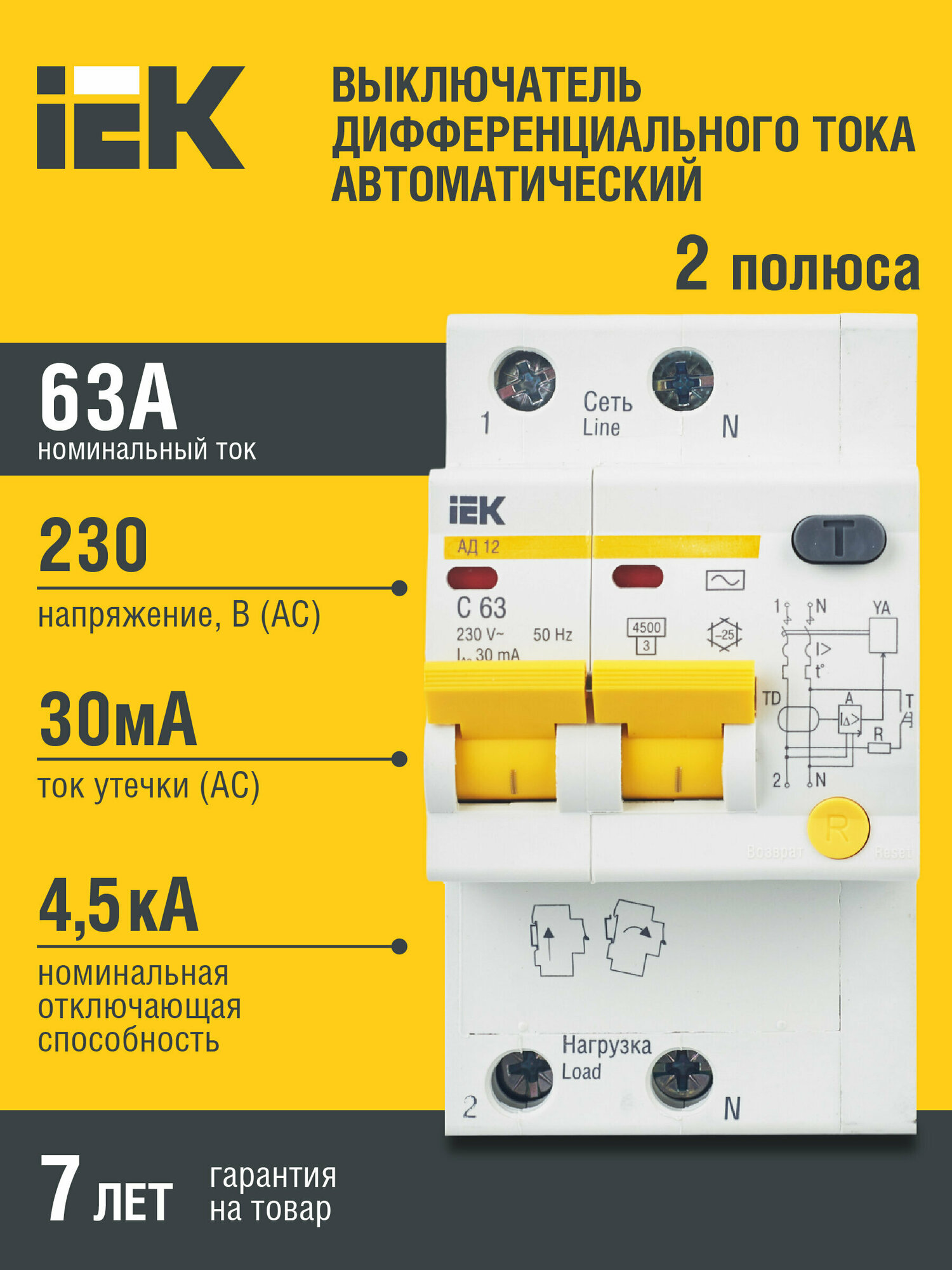 Дифференциальный автоматический выключатель АД12 2Р 63А 30мА IEK