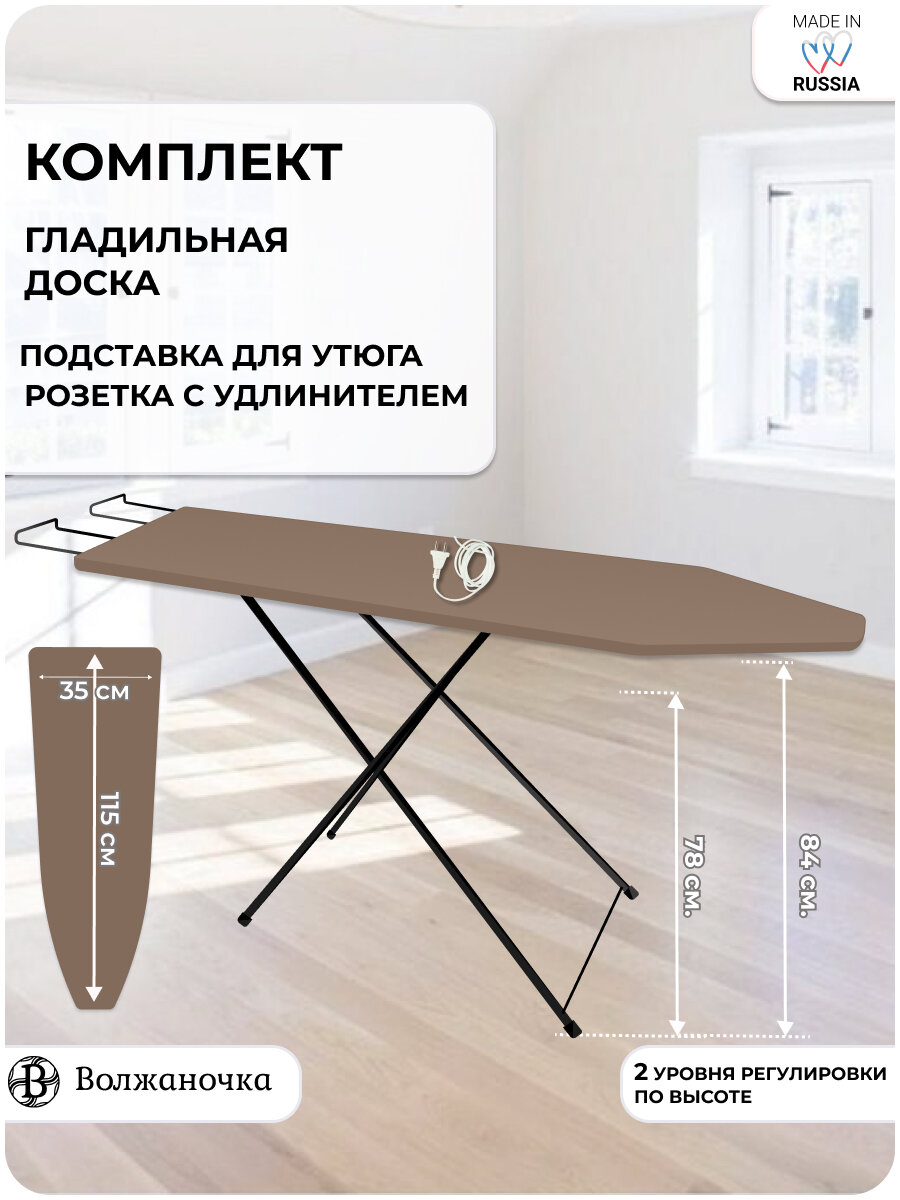 Купить Волжаночка Гладильная доска напольная с подставкой для утюга, розеткой и удлинителем, размер 115х35 см., цвет шоколадный