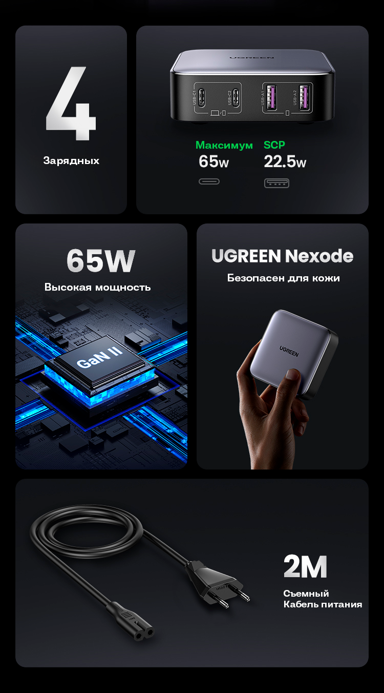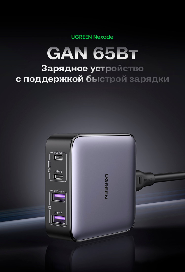 Сетевое зарядное устройство Nexode Ugreen, 2 USB A + 2 USB C, 65Вт, GaN (90747)