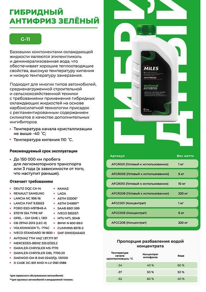 Ниже Вы можете прочитать отзывы на Антифриз готов к применению G11 (зеленый) 1кг (Super LONG LIFE COOLANT -40C) AFGR001 miles 1шт, ознакомится с подробными характеристиками, посмотреть интересные обзоры и фотографии на Антифриз готов к применению G11 (зеленый) 1кг (Super LONG LIFE COOLANT -40C) AFGR001 miles 1шт.