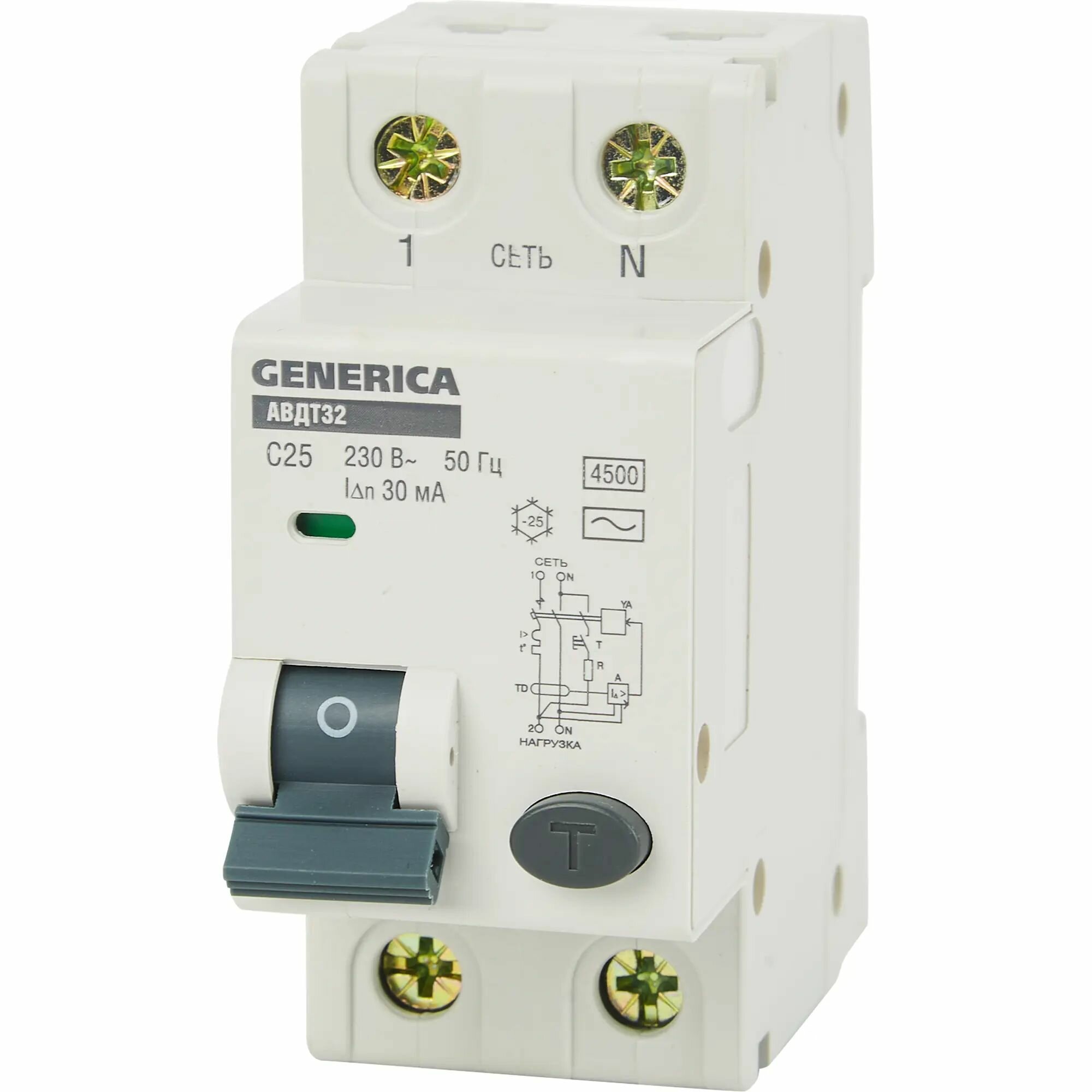 Дифференциальный автоматический выключатель Generica АВДТ 32, 2Р(1Р+N), C25, 30 мА, 4,5 кА
