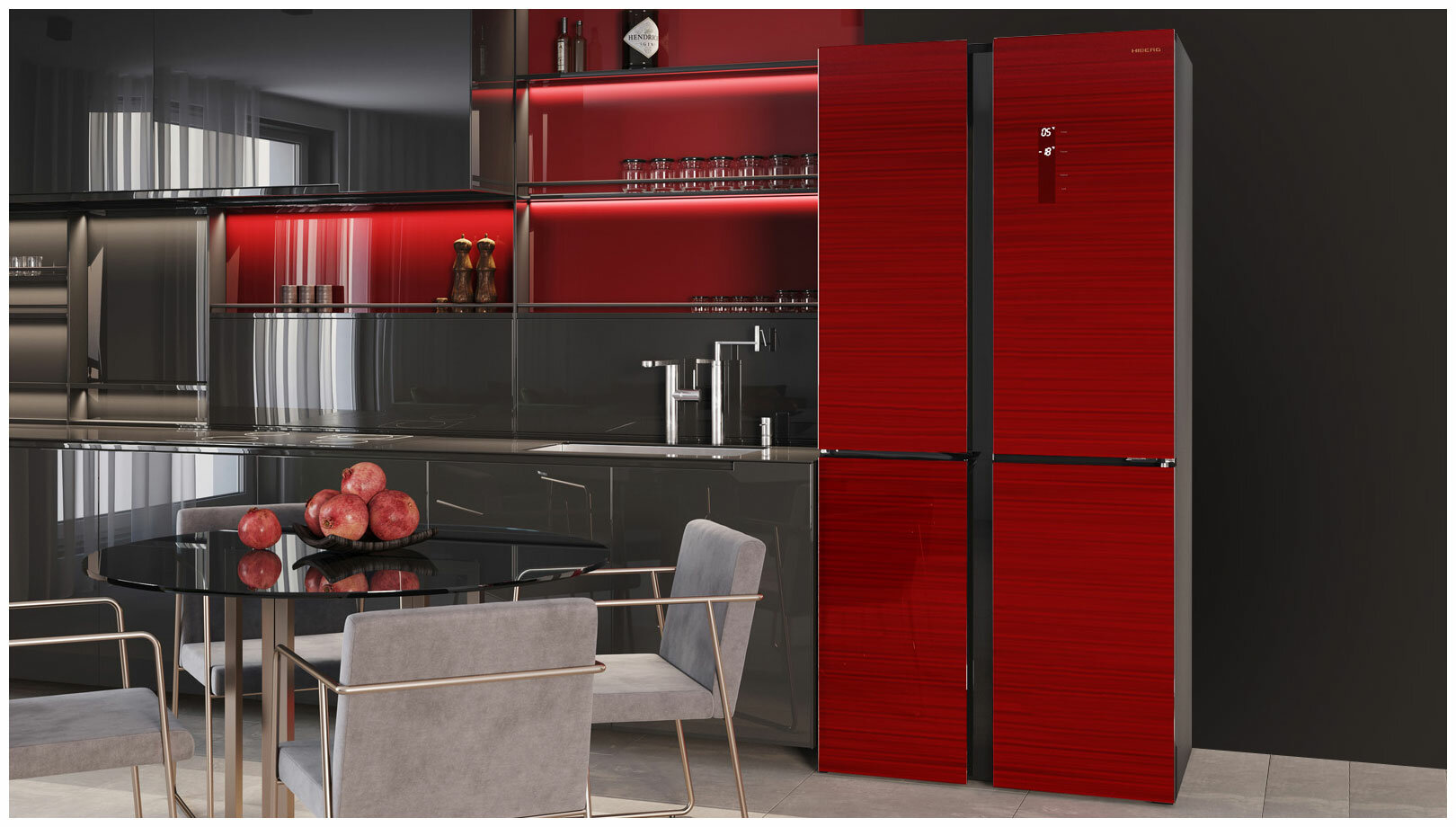 Холодильник HIBERG RFQ-500DX NFGR inverter отдельностоящий, 4 двери, 545 л, красное стекло с полоской