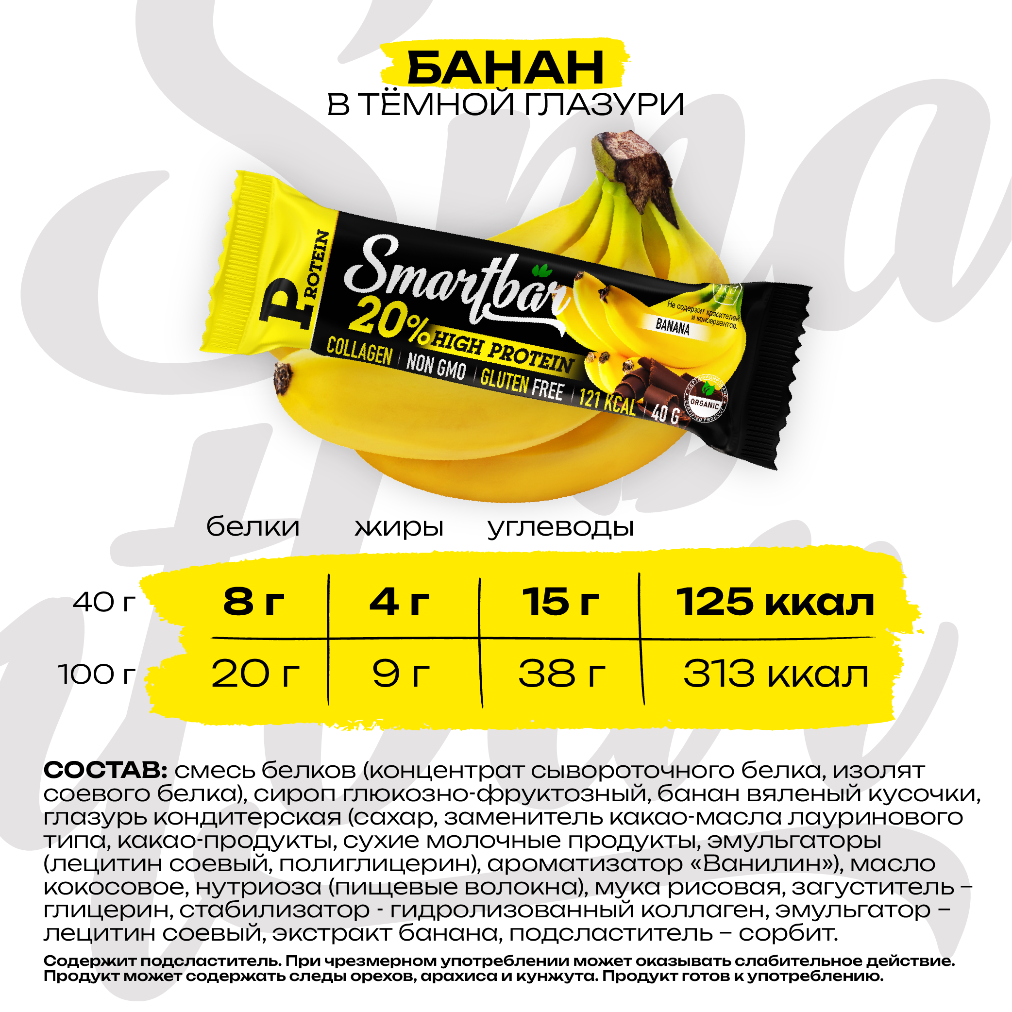 Батончик протеиновый Smartbar Protein L-carnitine "Банан-шоколад" с L-карнитином, 25 шт. х 40 г.