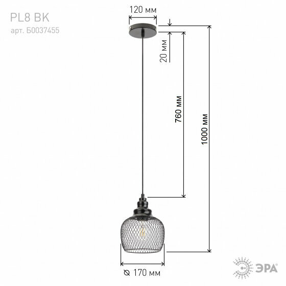 Светильник подвесной (подвес) ЭРА PL8 BK металл, E27, max 60W, высота плафона 220мм, подвеса 760мм, черный