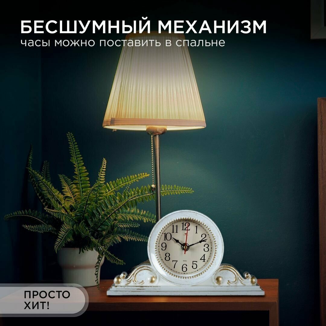 Часы настольные Рубин Классика корпус белый с золотом для спальни с плавным ходом арабскими цифрами пластиковый корпус и минеральное стекло 26 см