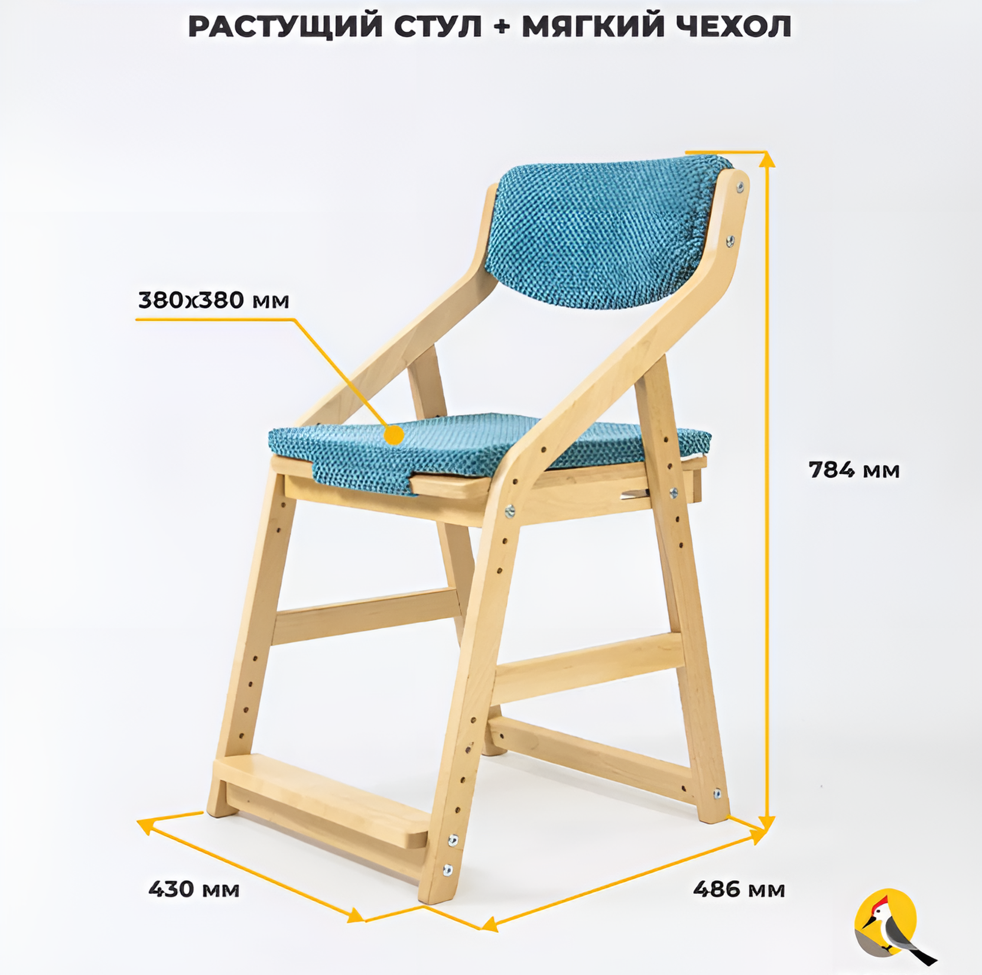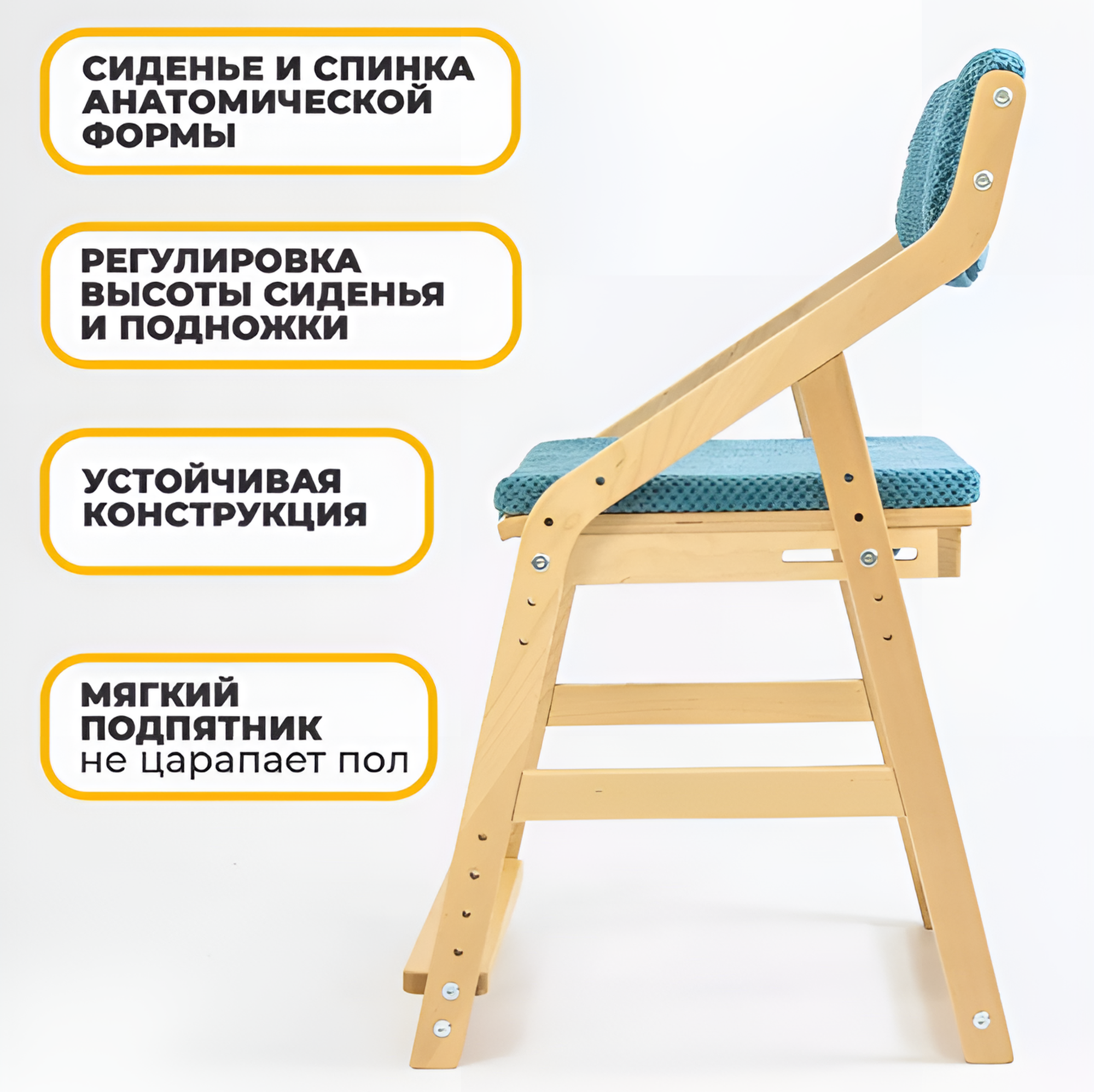 Стул детский регулируемый по высоте для школьника "Робин WOOD" натуральное дерево (ЛАК) с чехлом Лазурь