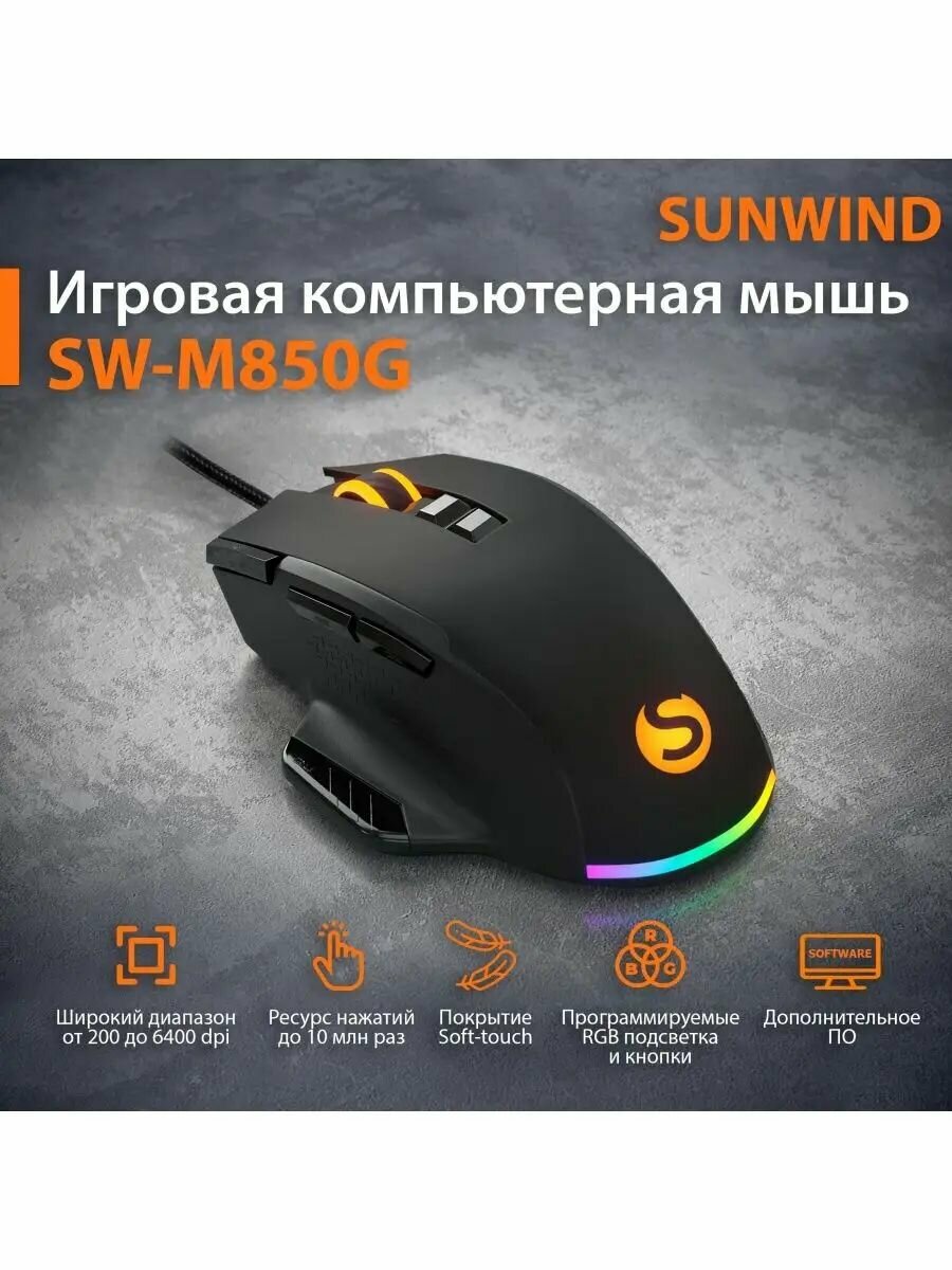 Мышь SunWind SW-M850G, игровая, оптическая, проводная, USB, черный [1422365]