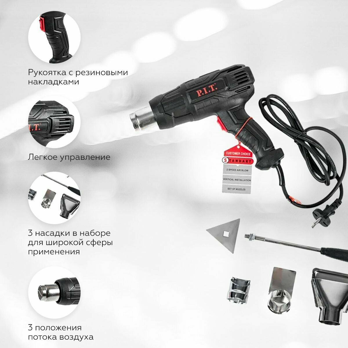 Фен строительный P.I.T PHG 2000-D, мощность 2000 Вт, защита от перегрева, с насадками