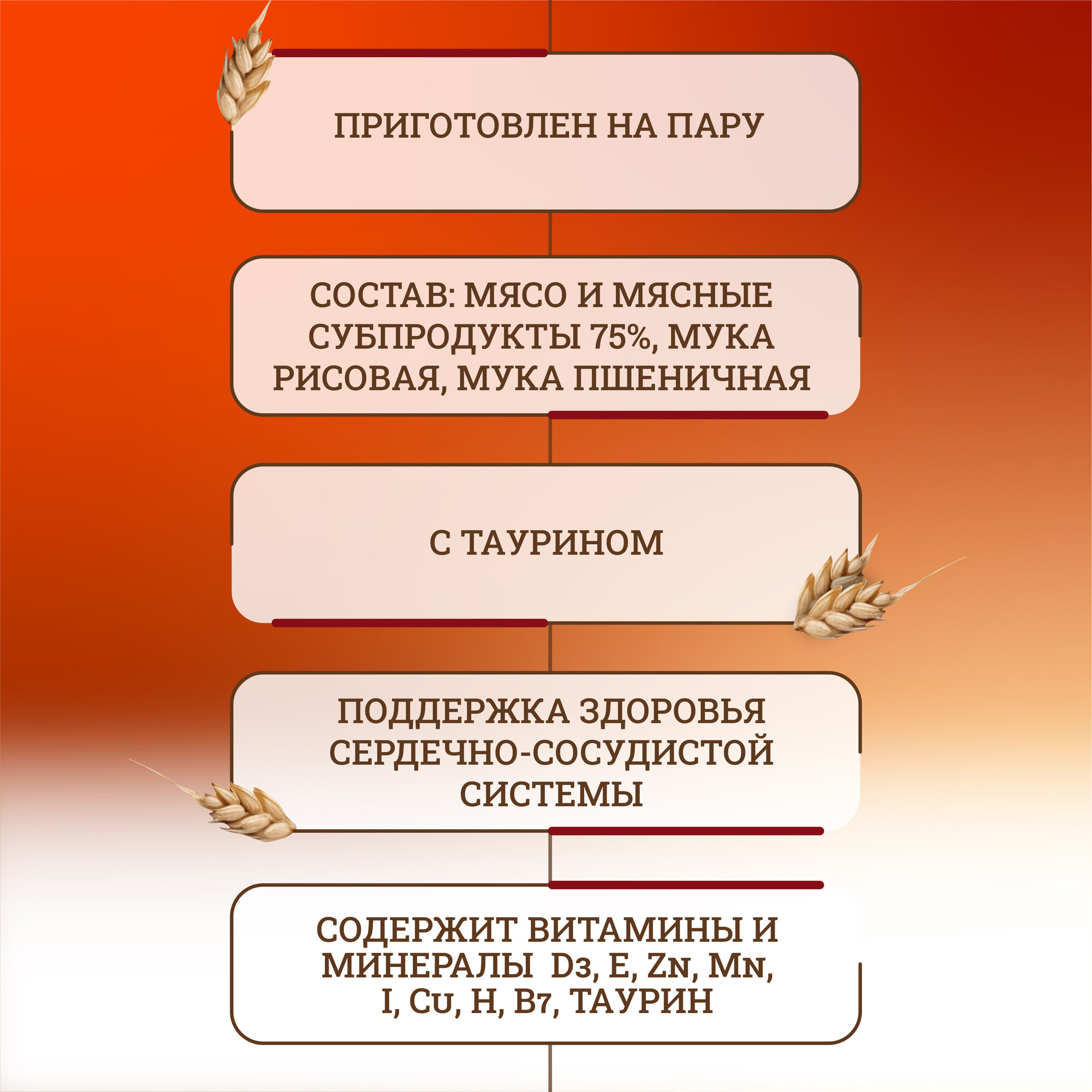 | Состав | мясо и мясные субпродукты 75 % (в том числе мясо цыпленка 10 %), мука рисовая, мука пшеничная, минерально-витаминный комплекс, загуститель |