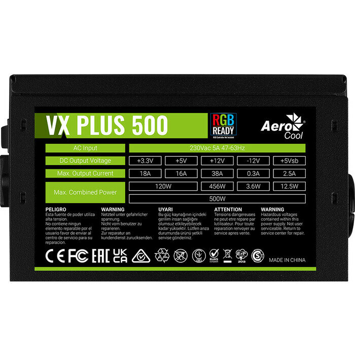 Блок питания 500 Вт ATX AeroCool VX Plus 500 RGB, 120 мм (4718009152687)