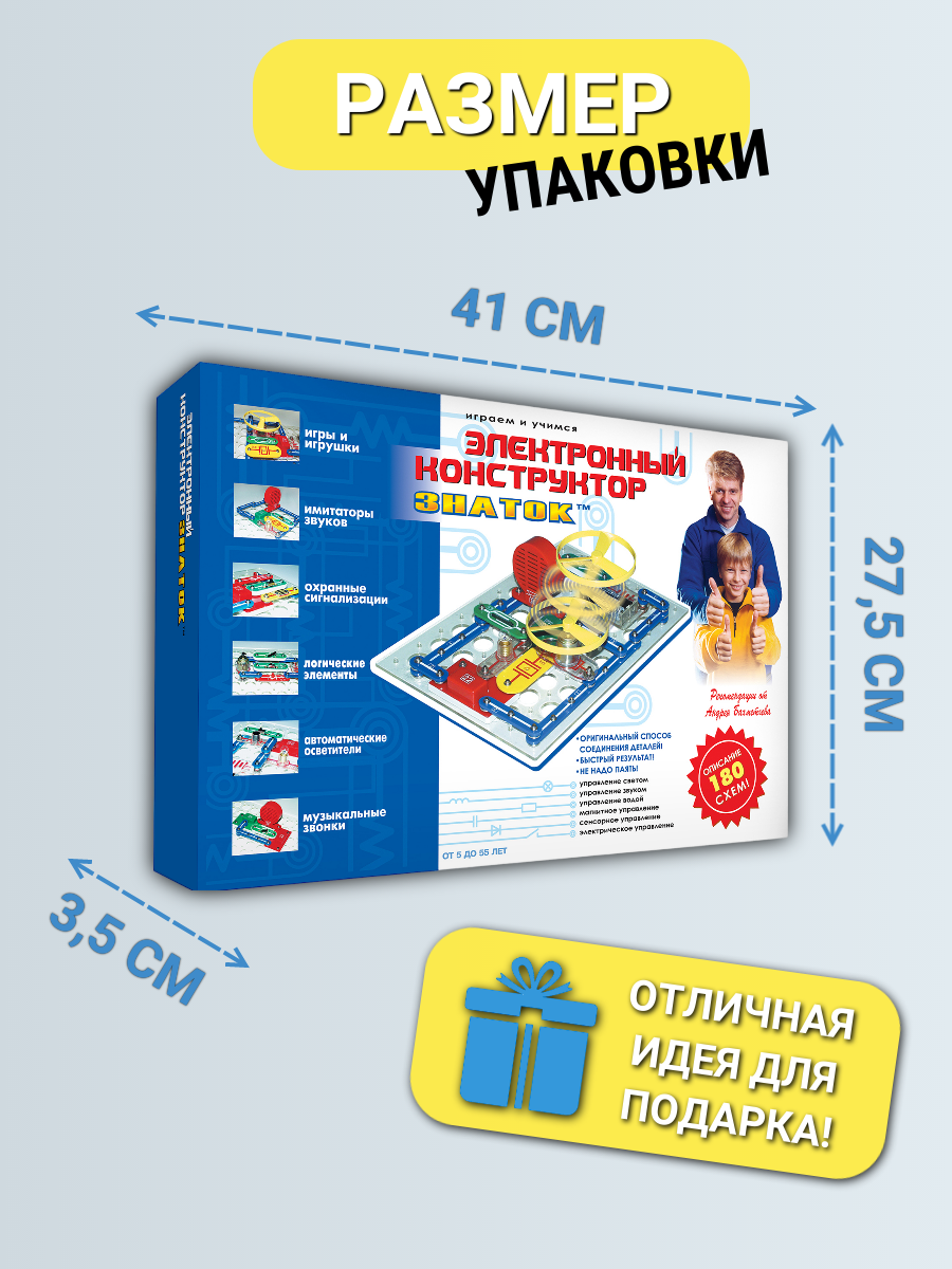 | Дополнительная информация | 180 схем, размер коробки 41х27,5х3,5 см, для работы схем необходимы 4 батареи (приобретаются отдельно) размера АА, напряжением 1,5 V, или аккумуляторы аналогичного размера, напряжением 1.2 V |