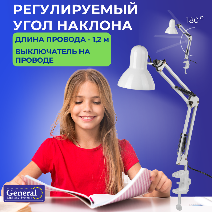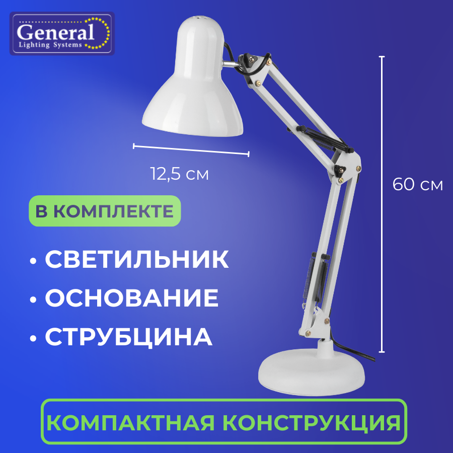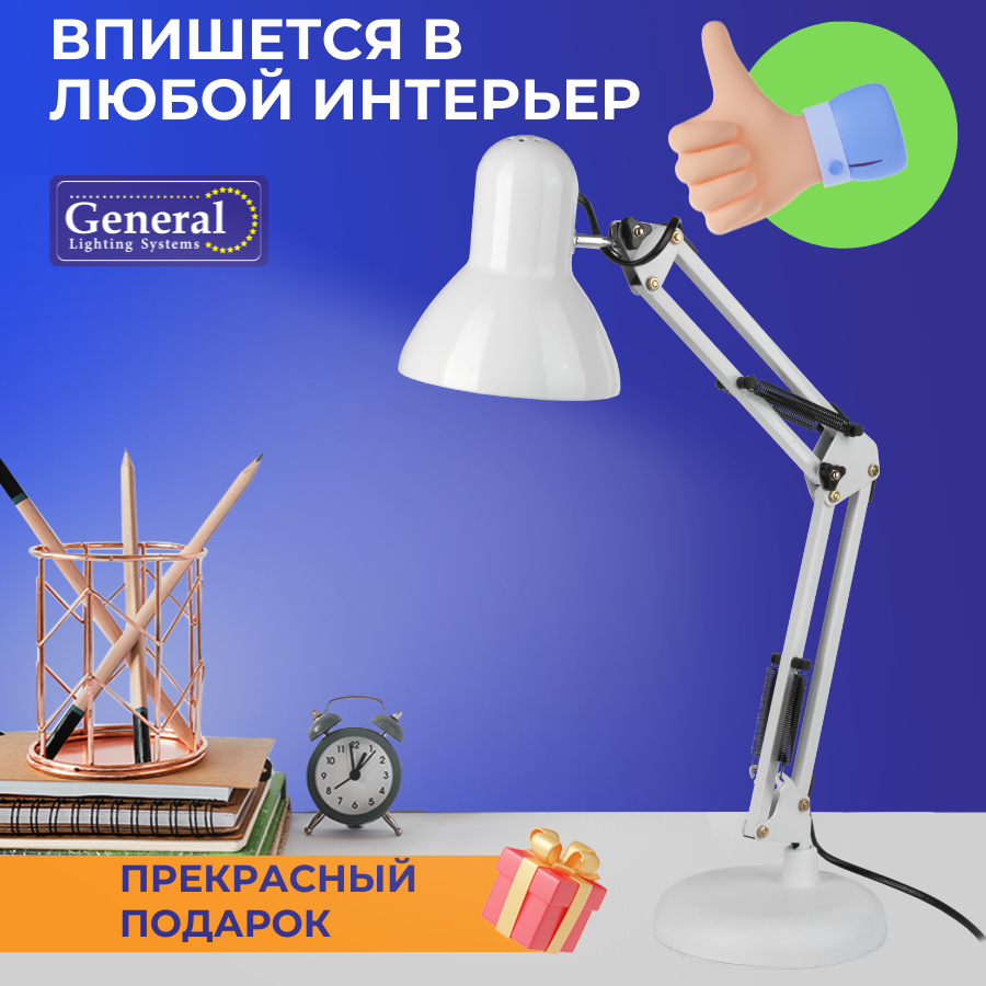 General, Светильник настольный, Цвет товара белый, Крепление Настольное;Струбцина, Тип цоколя E27, От сети 220В, Степень пылевлагозащищенности IP20
