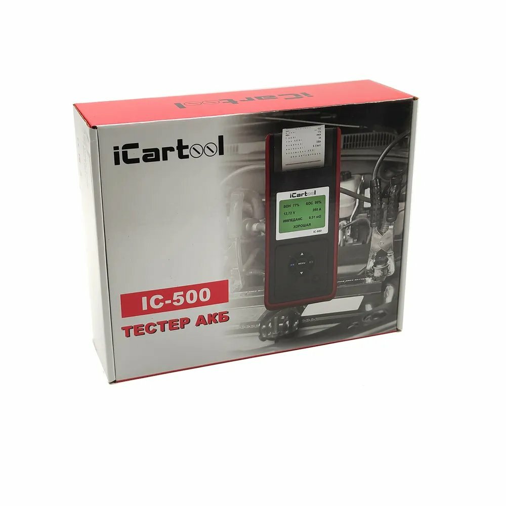 Тестер аккумуляторных батарей iCartool IC-500, АКБ 12/24В, до 2000А, тест системы пуска и зарядки, вольтметр, съемные кабели, принтер