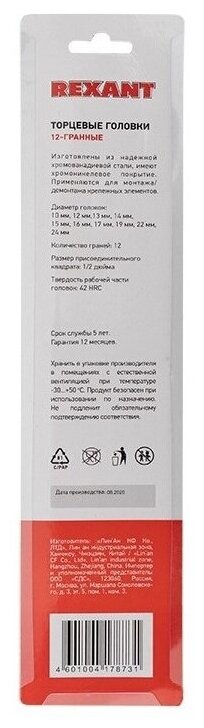 Набор торцевых головок Rexant 1/2", двенадцатигранные, CrV, 10-24 мм, 10 шт.