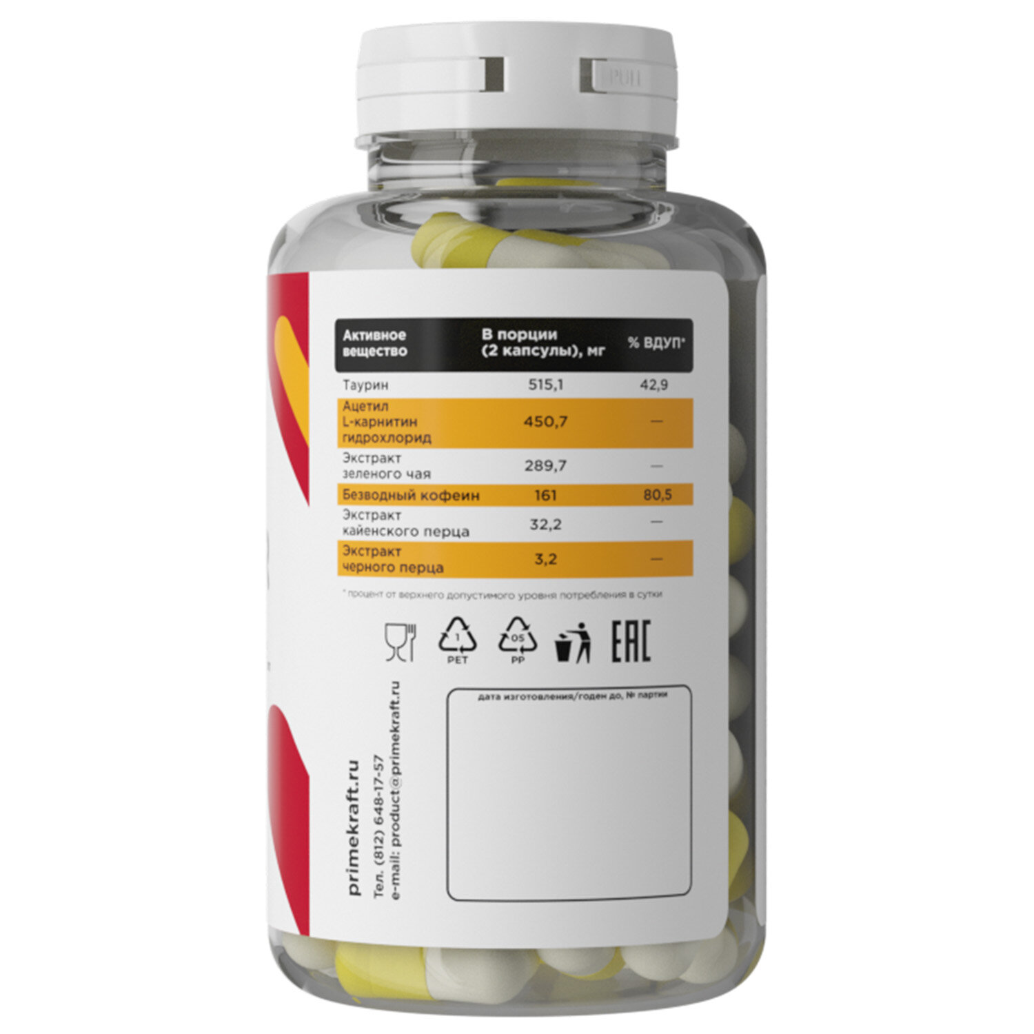 | Дополнительная информация | состав: таурин, ацетил-L-карнитин гидрохлорид, экстракт зеленого чая, безводный кофеин, экстракт кайенского перца, стеарат магния, экстракт черного перца, желатин (капсула). |
