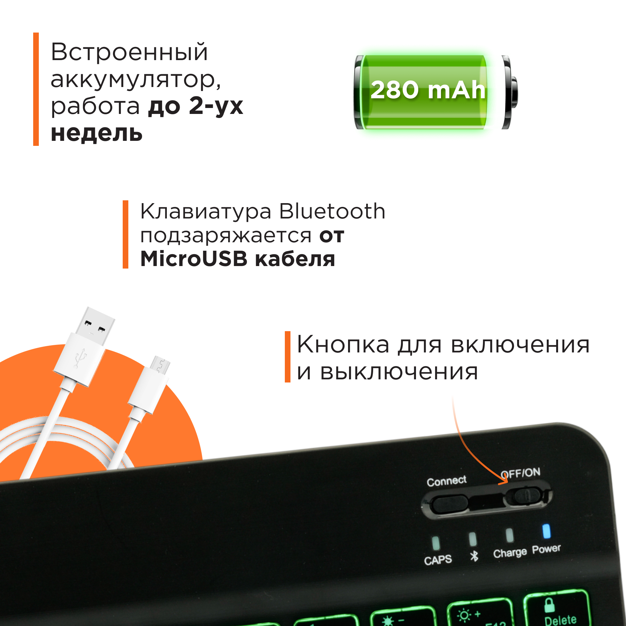 • Очень компактная • Подсветка яркая, можно выбрать режимы: постоянная или меняющая цвета • Инструкция по подключению и смене языка в комплекте • Зарядка в комплекте • Без проблем подключилась к IPad • Несмотря на пластик, прочная • Печатать удобно, есть английский и русский языки на клавишах одновременно |