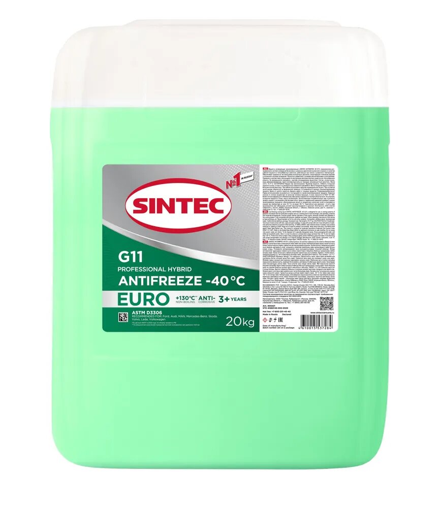 Sintec ANTIFREEZE SINTEC EURO G11 -40, силикатный антифриз 20кг для двигателя автомобиля, охлаждающая жидкость в авто, зелёный, готовый к применению