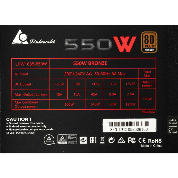 Ниже Вы можете прочитать отзывы на Блок питания LinkWorld ATX 550W LW-550B 80+ bronze (20+4pin) APFC 120mm fan 5xSATA RTL, ознакомится с подробными характеристиками, посмотреть интересные обзоры и фотографии на Блок питания LinkWorld ATX 550W LW-550B 80+ bronze (20+4pin) APFC 120mm fan 5xSATA RTL.