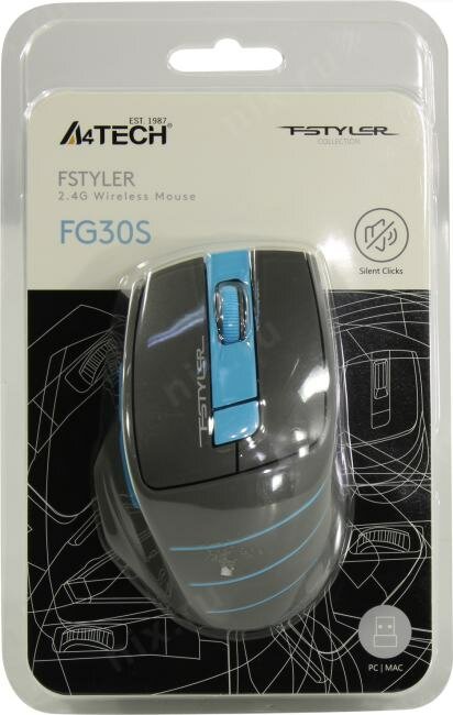 Мышь A4Tech Fstyler FG30S серая/синяя, оптическая (2000dpi), silent, беспроводная, USB (5 кнопок)