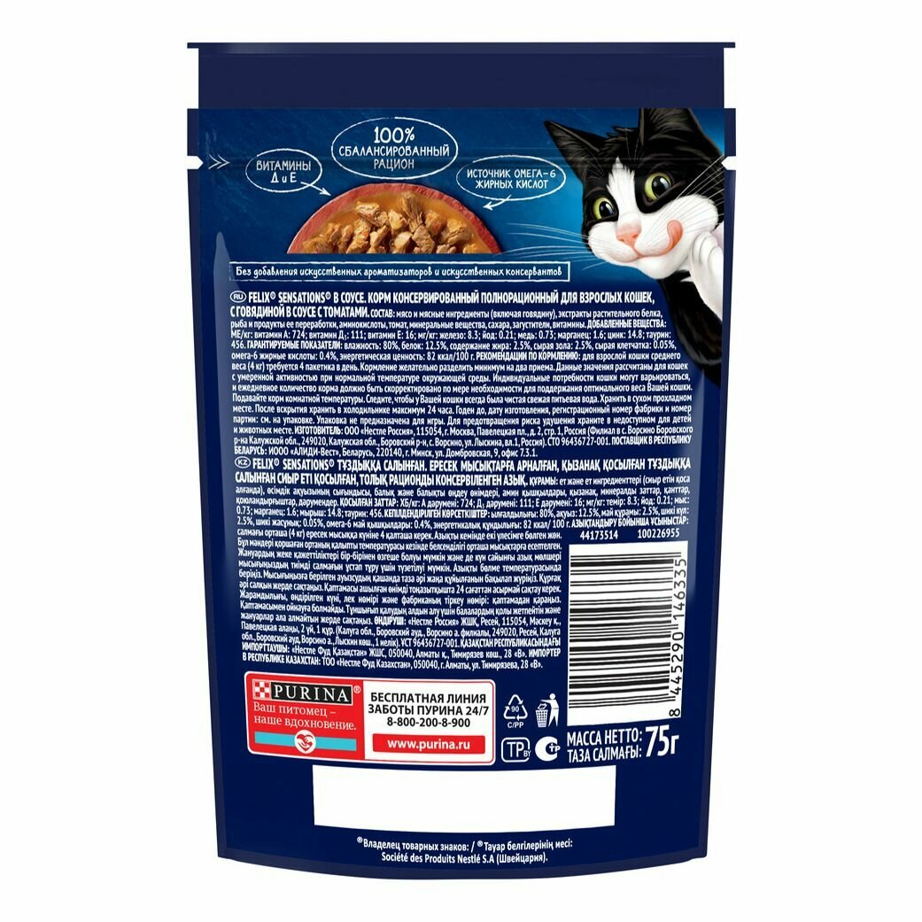 Влажный корм FELIX Sensations для взрослых кошек, с говядиной в желе с томатами, Пауч, 85 г, 24 шт
