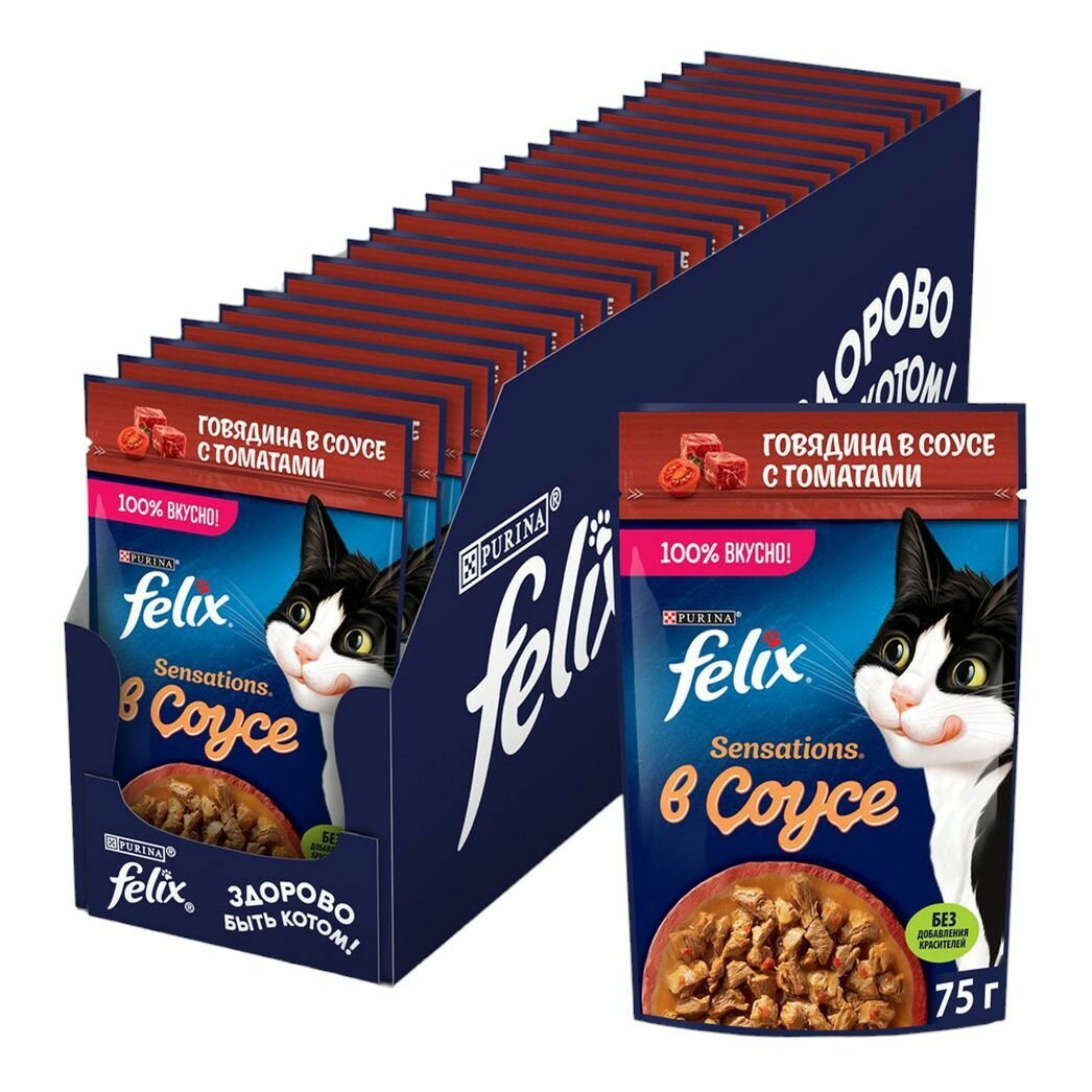Felix Паучи Sensations кусочки в желе для кошек с говядиной и томатами (12232833123189651244963712493529) | Sensations 0,085 кг 24142 (26 шт)