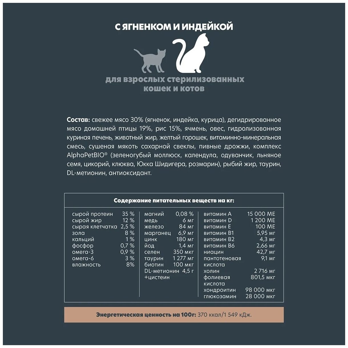 Сухой полнорационный корм AlphaPet (АльфаПет) Superpremium для взрослых стерилизованных кошек и котов, с ягненком и индейкой, 1,5 кг