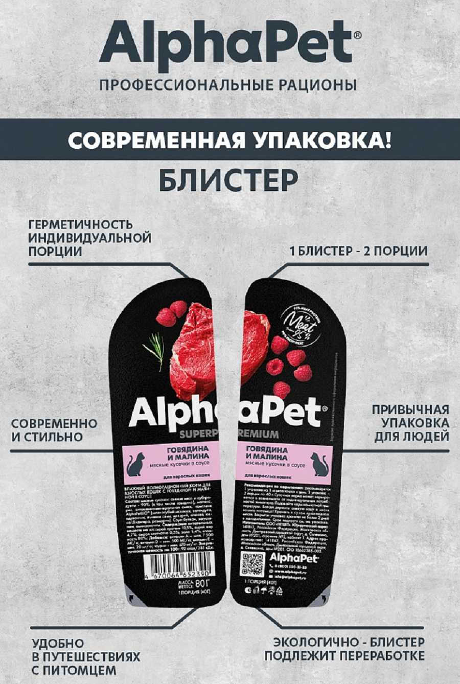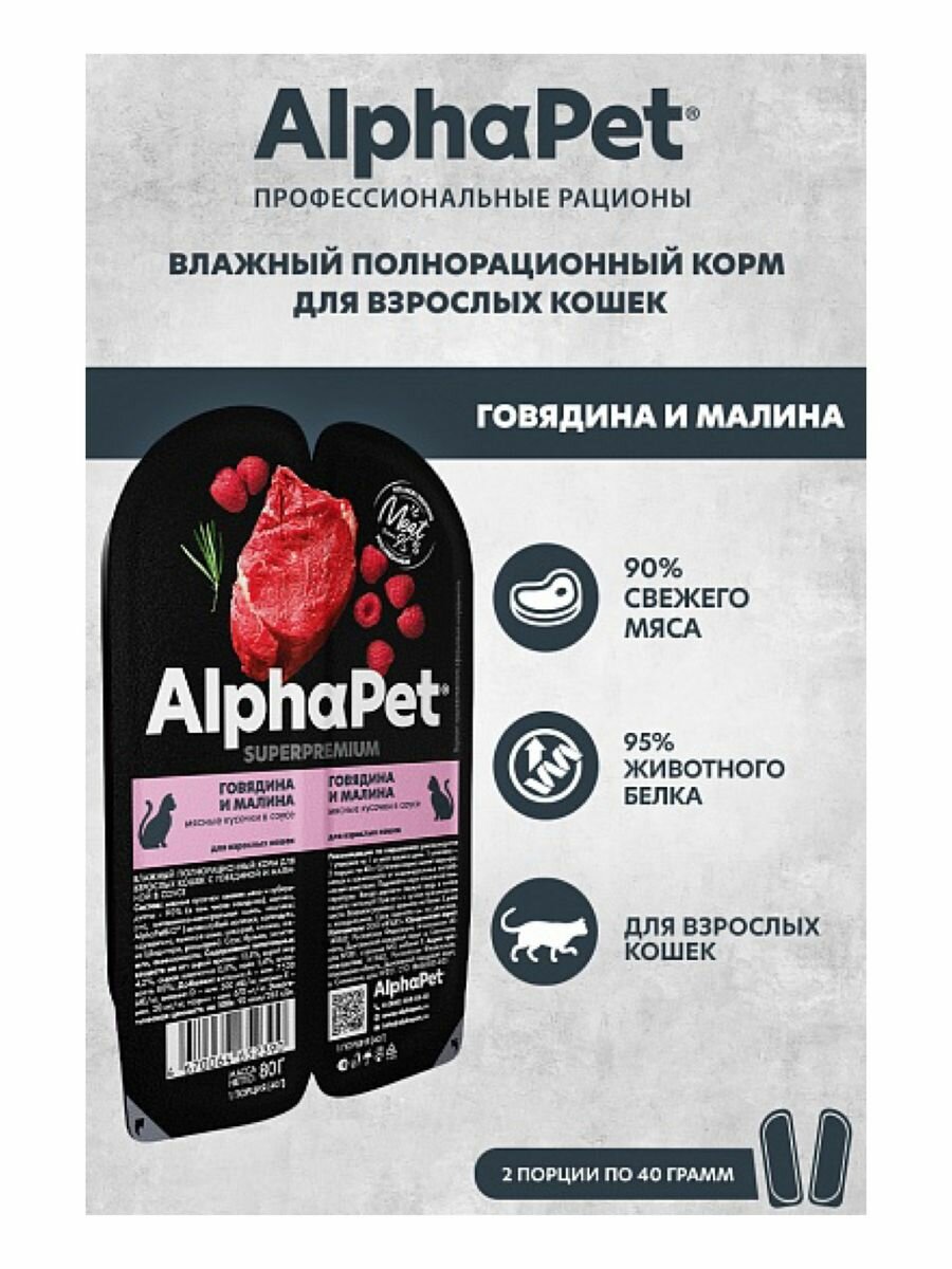 Влажный полнорационный корм AlphaPet Superpremium для кошек с говядиной и малиной в соусе 80г