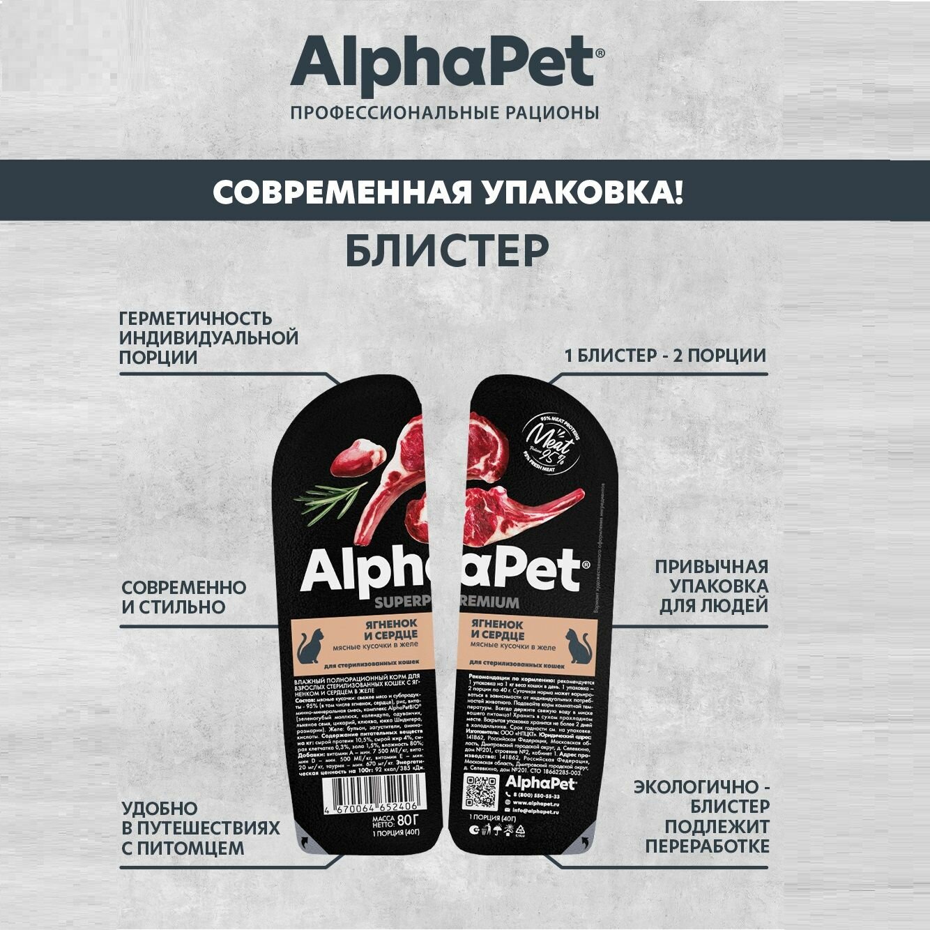 Влажный полнорационный корм для взрослых стерилизованных кошек AlphaPet Superpremium, Ягненок и сердце мясные кусочки в желе, 80г * 15шт