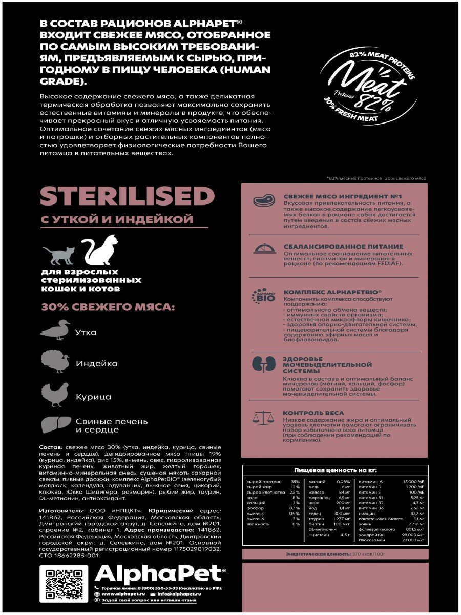 Корм AlphaPet Superpremium для стерилизованных кошек, c уткой и индейкой, 400 г