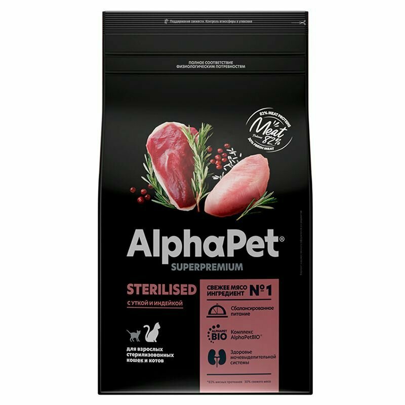 Сухой корм Alphapet Superpremium для взрослых стерилизованных кошек с уткой и индейкой, 1,5 кг