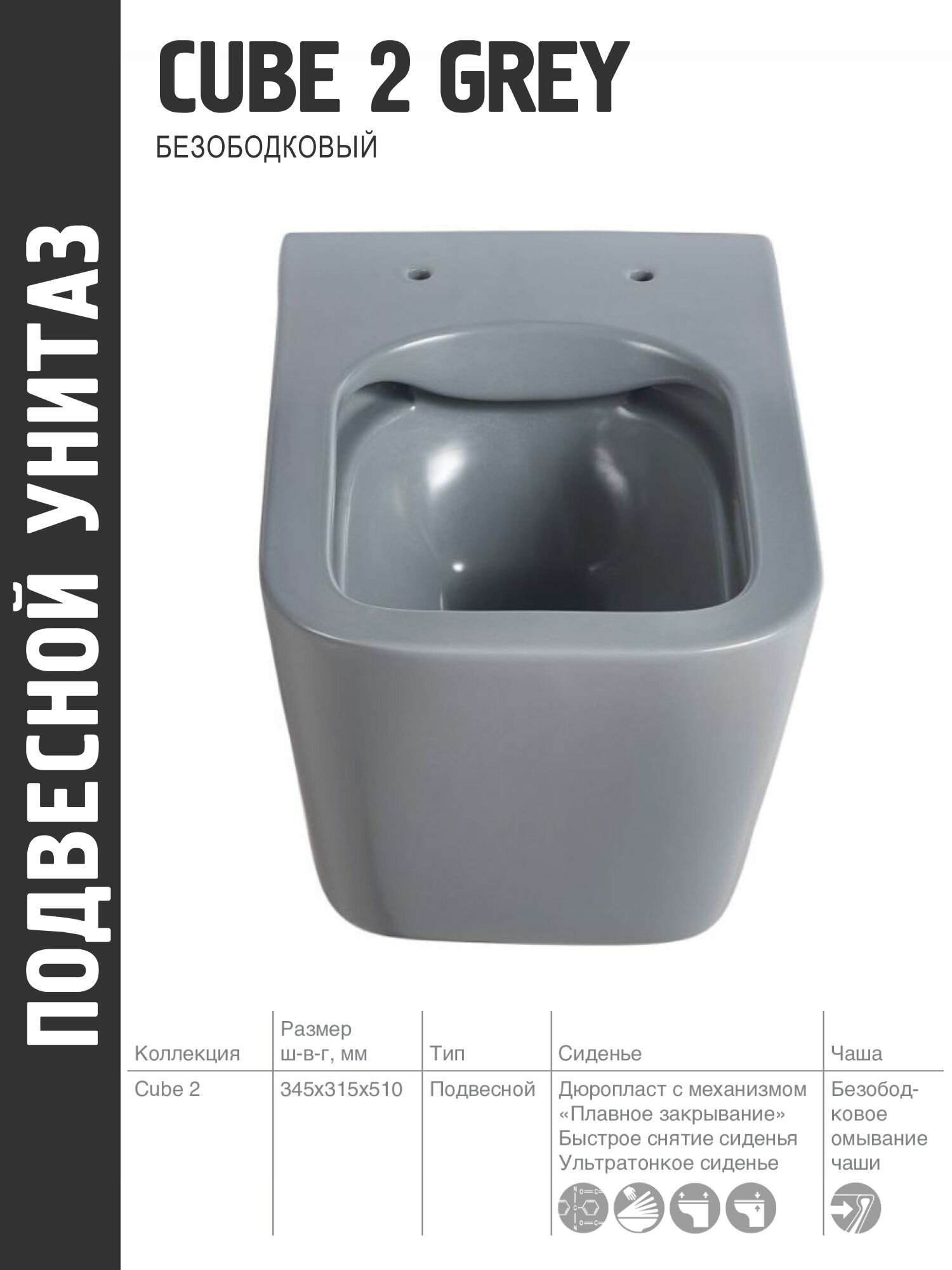 Подвесной унитаз CUBE 2 серый, безободковый с крышкой Soft-close интересное: