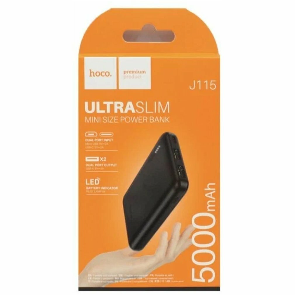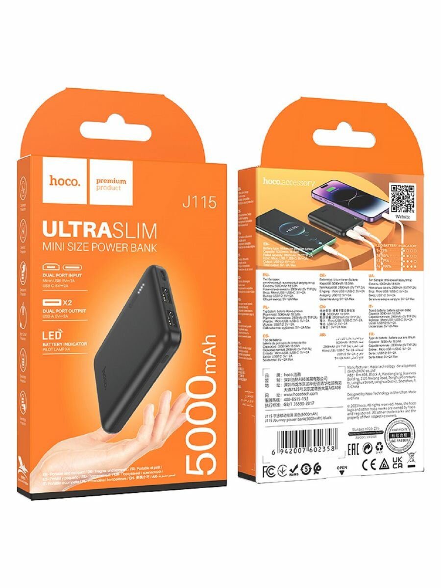 Компактный тонкий повербанк Hocо J115, 5000 mAh, черный, 10W, Micro-USB/USB-C